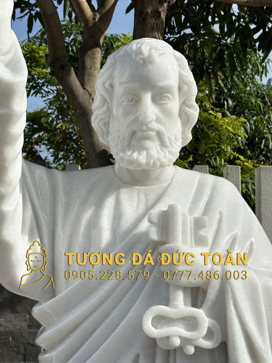 Tại CTY TNHH Điêu Khắc Đá Mỹ Nghệ Đức Toàn, tượng Thánh Phêrô bằng đá cẩm thạch trắng nguyên khối được chế tác tỉ mỉ, công phu với kích thước 2,2 x 0,8 x 0,55 (mét), màu trắng tinh khiết, tạo nên một công trình vừa trang nghiêm, vừa tôn quý – xứng đáng hiện diện trong các công trình nhà thờ, quảng trường, nghĩa trang Công giáo, khuôn viên tu viện, hoặc không gian tâm linh trong các hộ gia đình tín hữu.