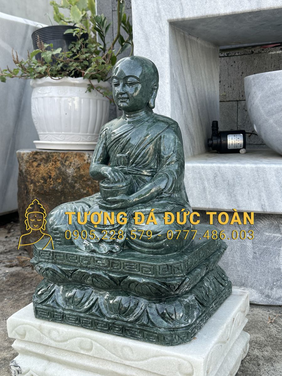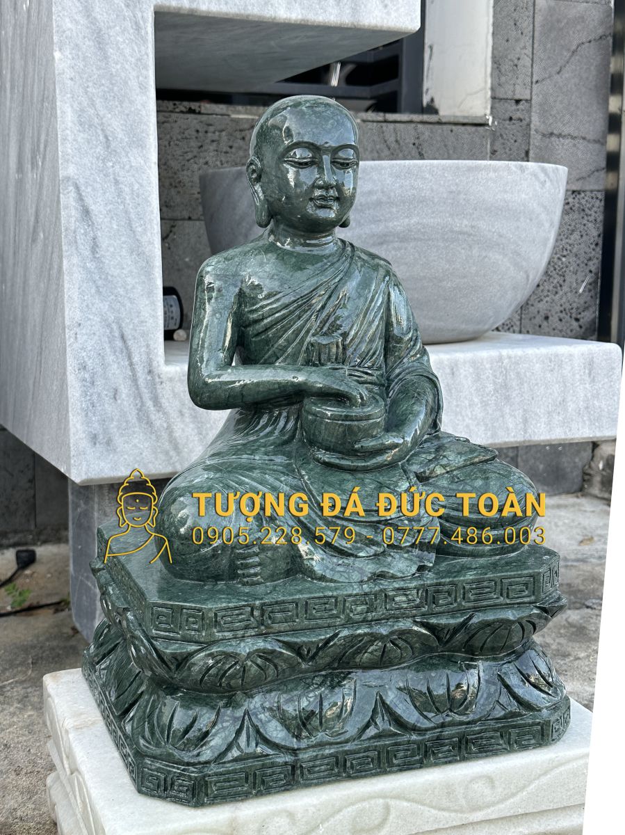 Tại Cty TNHH điêu khắc đá mỹ nghệ Đức Toàn, tượng Thánh Tăng Sivali bằng đá ngọc Ấn Độ màu xanh xẫm được chế tác thủ công trên chất liệu đá cao cấp nguyên khối, mang đến vẻ đẹp sang trọng, bền vững và đầy giá trị tâm linh. Với kích thước 40x28x22 cm, tượng phù hợp để đặt trên bàn thờ, kệ thờ, trong không gian tiếp khách hoặc thiền phòng.