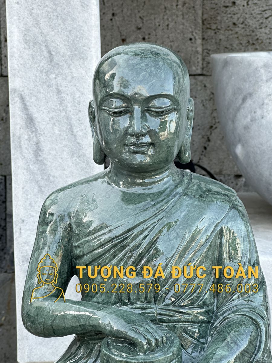 Điểm nổi bật của tượng chính là chất liệu chế tác: đá ngọc Ấn Độ xanh xẫm nguyên khối, loại đá tự nhiên quý hiếm có độ cứng và độ bóng rất cao, vân đá mịn, mang sắc xanh trầm ấm, rất phù hợp với không gian thiền định và tâm linh.